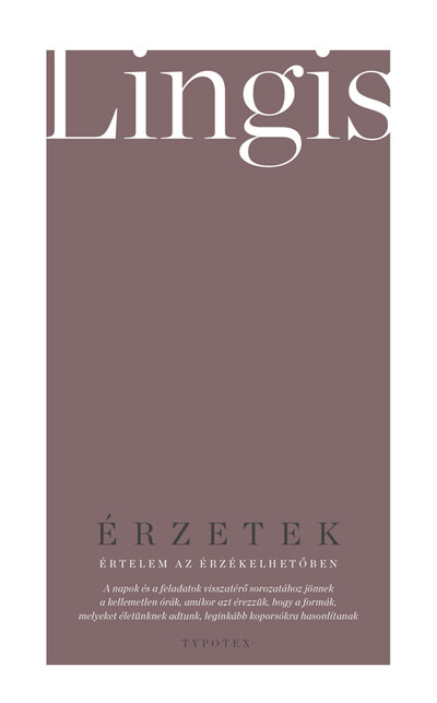 Alphonso Lingis (1933) hazánkban a kevéssé ismert szerzők közé tartozik, bár neve az Emmanuel Lévinas és Maurice Merleau-Ponty munkásságával foglalkozóknak fontos támpont. Az Egyesült Államokban különleges stílusú előadásai miatt kultikus alakként tartják számon. Gondolkodásának közvetlensége és emelkedett költőisége esszéiben is élénken magával ragad. Első magyar nyelvű kötetében az egzisztencializmus és a fenomenológia nézőpontjainak ütköztetésével helyezi új megvilágításba a testi érzetek, az érzékenység, az érzékiség és a hajlam fogalmait, az érző lényekkel és a környező világgal való kommunikációnkat. Az érzékelést a dolgok eszközként kezelésén túl a velünk szembesülő anyaguknál fogva értelmezi, a lévinasi másság válaszkényszerében. Világunk testileg irányít minket, vibrálunk fényében és elnyel sötétsége, vágyaink átlényegítenek. Másfelől Lingis Heidegger szorongáselméletét vonja kritika alá, aki a halál távlatában nézett az észlelésre és életünk lehetőségeire. Ez a nyomasztó téma komorságot kölcsönöz a kötetnek, és különös humorral ruházza fel, az irónia hűvösét az együttérzés enyhíti.